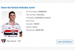 体育资讯04月04日讯 巴西足协官网的球员注册系统中显示,34岁奥斯卡与圣保罗已于当地时间4月2日解除合同!