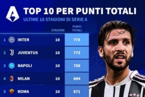 体育资讯3月21日讯 德国转会市场统计了过去10个赛季各队在意甲的总积分,并列出榜单,国米775分居首,尤文773分次席。