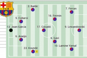 锋线上最大的疑问是亚马尔是否会出场,原则上费兰·托雷斯将首发出战此役,莱万则可能继续首发,拉什福德可能会休息,如果弗里克能够说服亚马尔轮休,鲁尼·巴德吉将出任右边锋。