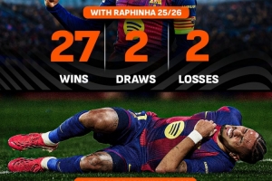 本赛季拉菲尼亚在场巴萨输球率仅为6%,缺阵情况下飙升至33%